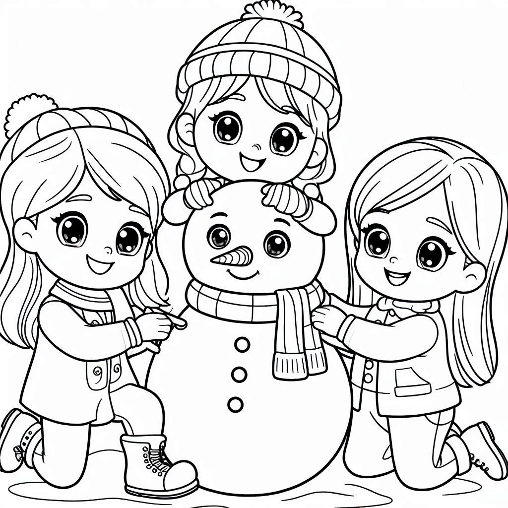 דף צביעה תמונה של ילדות בונות איש שלג לצביעה בחינם להדפסה או צביעה אונליין