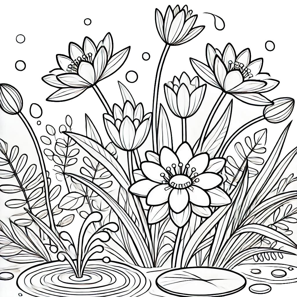 דף צביעה להדפסה או להורדה חינם של פרחים במים