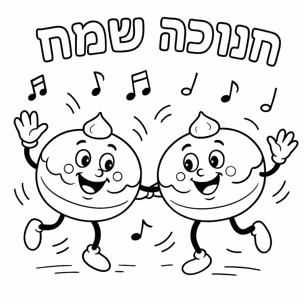 דף צביעה להדפסה או להורדה חינם של חג חנוכה שמח סופגניות רוקדות