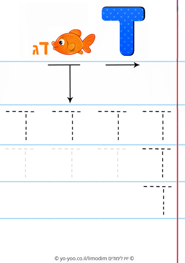 איך לכתוב את האות ד בכתב דפוס, דף עבודה של האות ד בכתב דפוס, תרגול כתיבה של האות ד בעברית, כתיבת האות ד בכתב קטנים בעברית בחינם להורדה או להדפסה