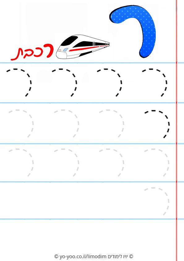 איך לכתוב את האות ר בכתב יד, דף עבודה של האות ר בכתב יד, תרגול כתיבה של האות ר בעברית, כתיבת האות ר בכתב גדולים בעברית בחינם להורדה או להדפסה