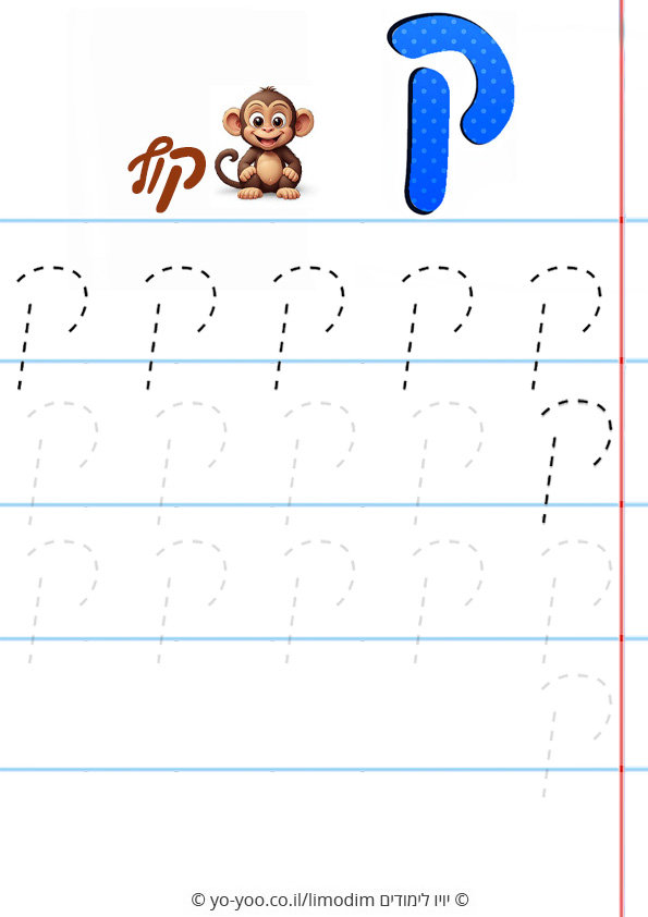 איך לכתוב את האות ק בכתב יד, דף עבודה של האות ק בכתב יד, תרגול כתיבה של האות ק בעברית, כתיבת האות ק בכתב גדולים בעברית בחינם להורדה או להדפסה