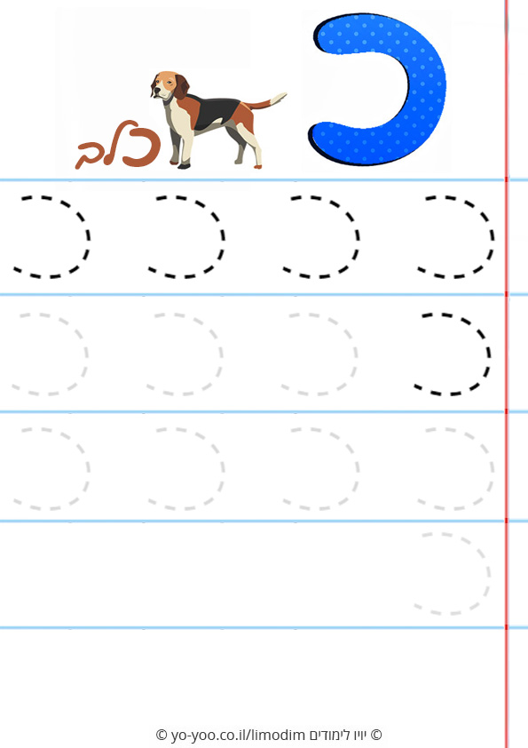 איך לכתוב את האות כ בכתב יד, דף עבודה של האות כ בכתב יד, תרגול כתיבה של האות כ בעברית, כתיבת האות כ בכתב גדולים בעברית בחינם להורדה או להדפסה