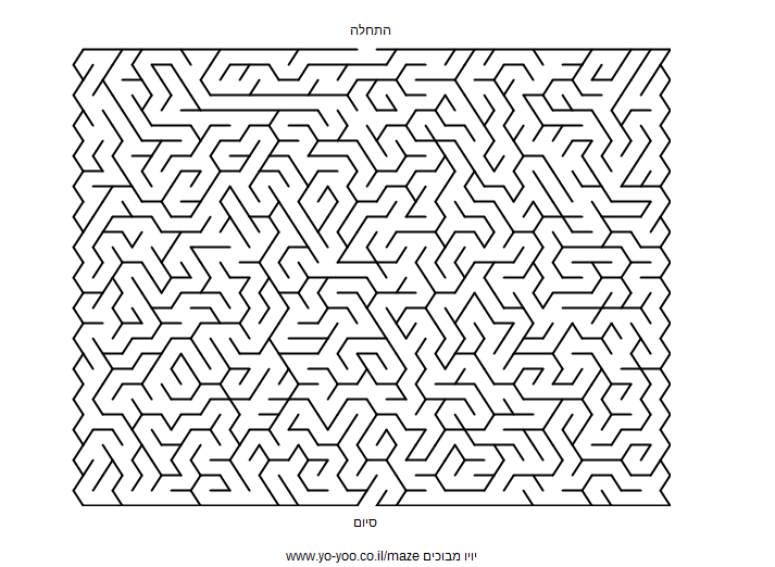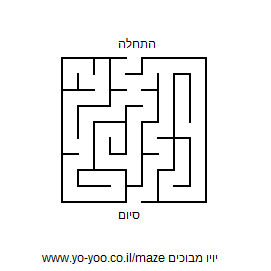 1. לחצו על כפתור "הדפסת מבוך" - הדפיסו ופתרו את המבוך 2.מבוך להדפסה במחשב - לחצו העתק על המבוך והדביקו בתוכנת בוורד או תוכנה אחרת במחשב 3.מבוך להורדה - ניתן להוריד את המבוך למחשב ולהדפיס 4. הורידו למחשב, פתחו באמצעות תוכנת צייר ופתרו |