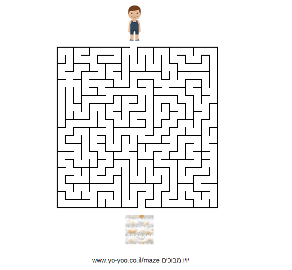 1. לחצו על כפתור "הדפסת מבוך" - הדפיסו ופתרו את המבוך 2.מבוך להדפסה במחשב - לחצו העתק על המבוך והדביקו בתוכנת בוורד או תוכנה אחרת במחשב 3.מבוך להורדה - ניתן להוריד את המבוך למחשב ולהדפיס 4. הורידו למחשב, פתחו באמצעות תוכנת צייר ופתרו |
