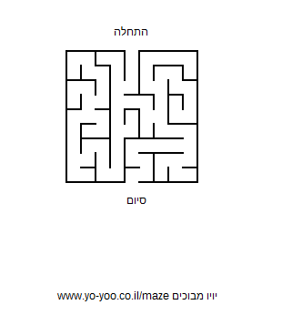 1. לחצו על כפתור "הדפסת מבוך" - הדפיסו ופתרו את המבוך 2.מבוך להדפסה במחשב - לחצו העתק על המבוך והדביקו בתוכנת בוורד או תוכנה אחרת במחשב 3.מבוך להורדה - ניתן להוריד את המבוך למחשב ולהדפיס 4. הורידו למחשב, פתחו באמצעות תוכנת צייר ופתרו |