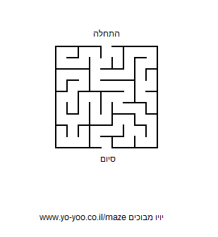 1. לחצו על כפתור "הדפסת מבוך" - הדפיסו ופתרו את המבוך 2.מבוך להדפסה במחשב - לחצו העתק על המבוך והדביקו בתוכנת בוורד או תוכנה אחרת במחשב 3.מבוך להורדה - ניתן להוריד את המבוך למחשב ולהדפיס 4. הורידו למחשב, פתחו באמצעות תוכנת צייר ופתרו |