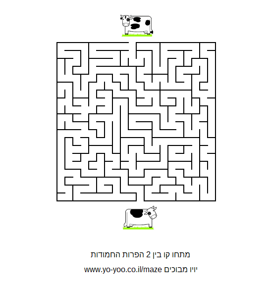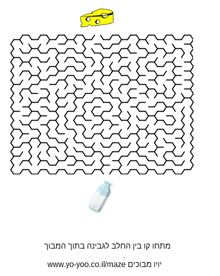 1. לחצו על כפתור "הדפסת מבוך" - הדפיסו ופתרו את המבוך 2.מבוך להדפסה במחשב - לחצו העתק על המבוך והדביקו בתוכנת בוורד או תוכנה אחרת במחשב 3.מבוך להורדה - ניתן להוריד את המבוך למחשב ולהדפיס 4. הורידו למחשב, פתחו באמצעות תוכנת צייר ופתרו |