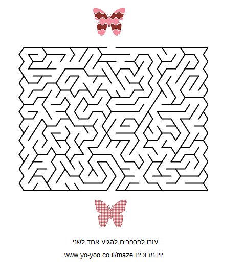 1. לחצו על כפתור "הדפסת מבוך" - הדפיסו ופתרו את המבוך 2.מבוך להדפסה במחשב - לחצו העתק על המבוך והדביקו בתוכנת בוורד או תוכנה אחרת במחשב 3.מבוך להורדה - ניתן להוריד את המבוך למחשב ולהדפיס 4. הורידו למחשב, פתחו באמצעות תוכנת צייר ופתרו |