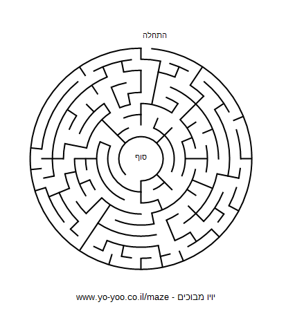 1. לחצו על כפתור "הדפסת מבוך" - הדפיסו ופתרו את המבוך 2.מבוך להדפסה במחשב - לחצו העתק על המבוך והדביקו בתוכנת בוורד או תוכנה אחרת במחשב 3.מבוך להורדה - ניתן להוריד את המבוך למחשב ולהדפיס 4. הורידו למחשב, פתחו באמצעות תוכנת צייר ופתרו |