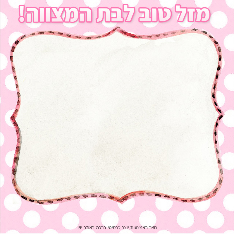 ברכה עם רקע ורוד לבת מצווה כרטיס ברכה מהמם עם מסגרת וצבע ורוד לבת מצווה כתבו על הברכה מה שתרצו ותוכלו להוסיף תמונות שלכן עם חוגגת בת המצווה כמובן כתבו פה את הברכה שלכם לחצו פעמיים בכדי לערוך את הטקסט