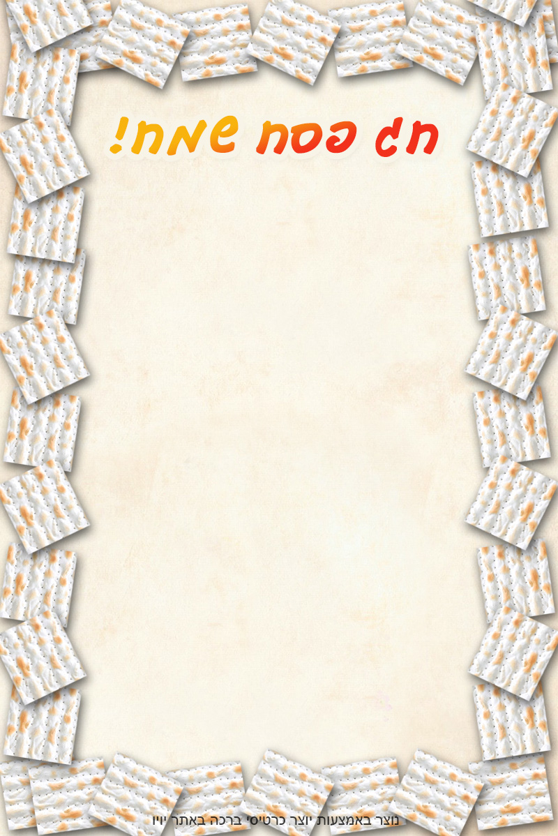 כרטיס ברכה לחג פסח – מסגרת מצות כרטיס ברכה מגניב לחג פסח עם מסגרת של מצות כתבו ברכה מקורית משלכם, הוסיפו תמונות , סטיקרים ועוד והדפיסו או שמרו את הכרטיס כתבו פה את הברכה שלכם לחצו פעמיים בכדי לערוך את הטקסט