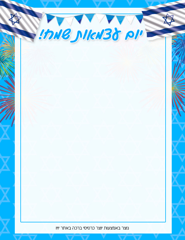 כרטיס ברכה מעוצב ליום העצמאות כרטיס ברכה יפה ומעוצב ליום העצמאות עם הכיתוב יום עצמאות שמח ניתן לעריכה אישית, להוספת ברכה אישית והדפסה בחינם ובקלות כתבו פה את הברכה שלכם לחצו פעמיים בכדי לערוך את הטקסט