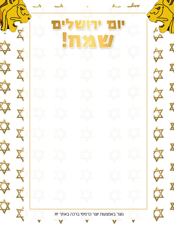 כרטיס ברכה ליום ירושלים כרטיס ברכה ליום ירושלים כרטיס ברכה מעוצב יפה עם כיתוב יום ירושלים שמח עם אפשרות להוספת ברכה אישית להדפסה ולהורדה במחשב כתבו פה את הברכה שלכם לחצו פעמיים בכדי לערוך את הטקסט