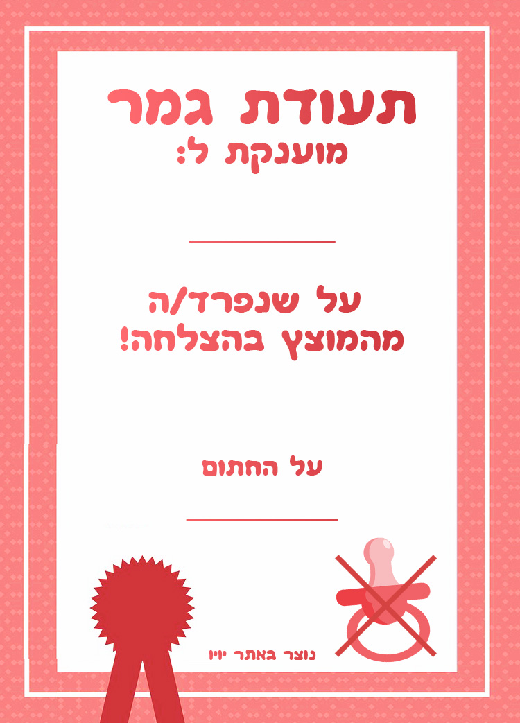 תעודת גמילה מהמוצץ לילד/ה שנגמל/ה מהמוצצים , תעודת גמר מגניבה להדפסה
