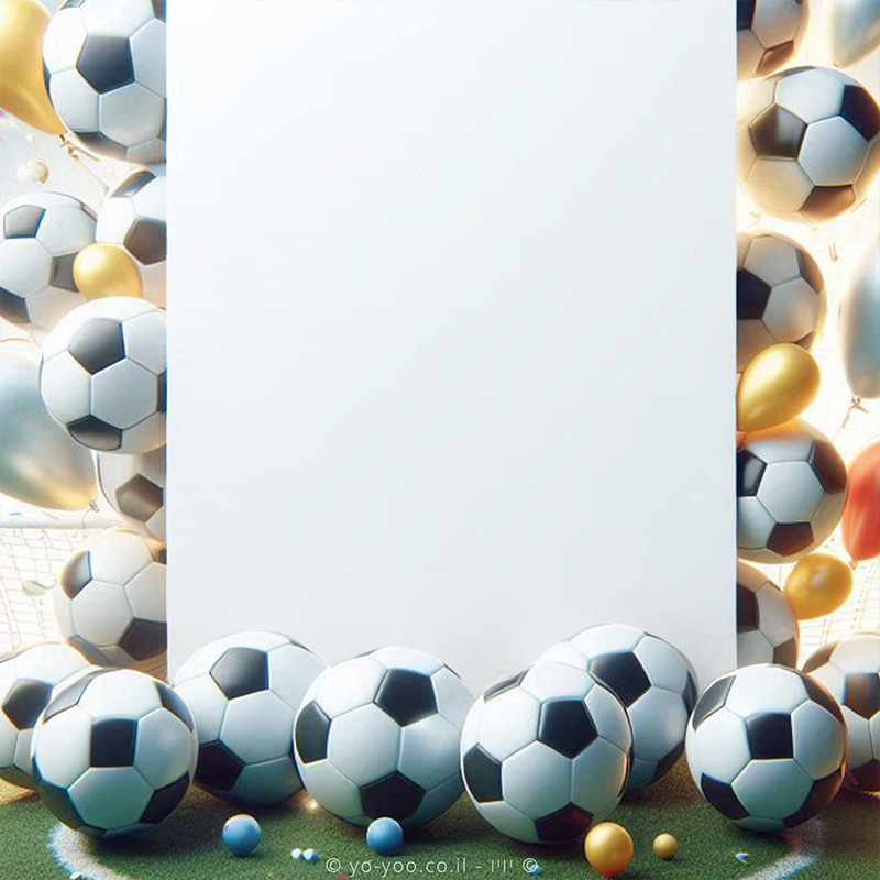 כרטיס ברכה מעוצב בחינם עם מסגרת ייחודית של כדורי כדורגל על רקע דשא, בשילוב בלונים חגיגיים בזהב וכסף. מתאים לברכת יום הולדת לחובבי כדורגל, הזמנה למסיבת כדורגל או כל אירוע ספורטיבי מיוחד.