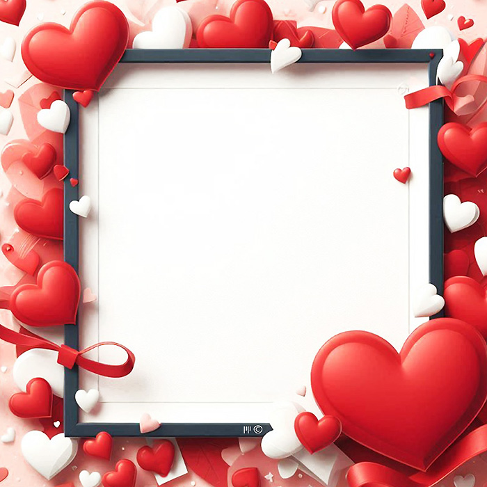 כרטיס ברכה מעוצב בחינם עם מסגרת קלאסית בצבע כהה, מוקפת בלבבות אדומים ולבנים תלת-ממדיים בסגנון רומנטי. מתאים לכתיבת ברכה ליום האהבה, יום נישואין, הצעת נישואין או כל אירוע חגיגי באווירה רומנטית.