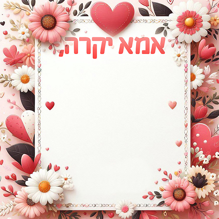 כרטיס ברכה מעוצב בחינם עם מסגרת עדינה של פרחים צבעוניים ולבבות קטנים, ובראשו הכיתוב "אמא יקרה". מושלם לברכת יום האם, יום הולדת של אמא או כל אירוע מיוחד שבו רוצים להביע אהבה והערכה לאמא היקרה.