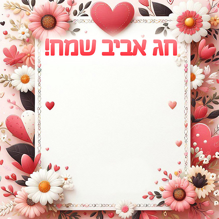כרטיס ברכה מעוצב בחינם עם מסגרת עדינה של פרחים צבעוניים ולבבות קטנים, ובראשו הכיתוב "חג אביב שמח!". מתאים לשליחת ברכות חגיגיות לחג הפסח או לכל חגיגה אביבית שמחה.