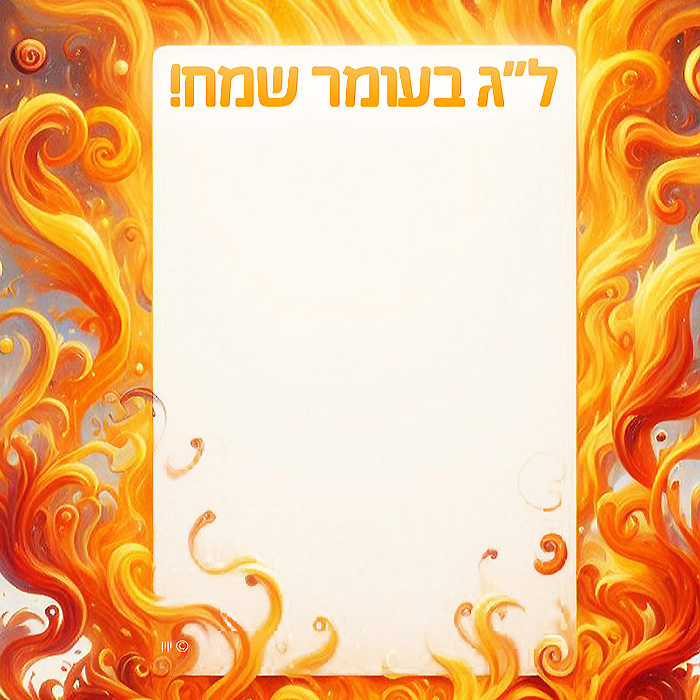 כרטיס ברכה מעוצב בחינם עם מסגרת מרהיבה של להבות אש בצבעי כתום וזהב, ובראשו הכיתוב "ל"ג בעומר שמח!". מתאים לשליחת ברכות חגיגיות לכבוד ל"ג בעומר, שיתוף איחולים לחג המדורות ולעיצוב ברכות מיוחדות.