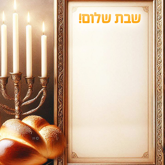 כרטיס ברכה מעוצב בחינם עם מסגרת קלאסית ומפוארת, בצד שמאל חלות שבת קלועות ונרות שבת דולקים באווירה חמימה ומרגיעה. בראש התמונה מופיע הכיתוב "שבת שלום!". מתאים לשליחת ברכות לשבת, פרסום איחולים לשבת קודש, והדפסת ברכות עם מסר אישי.