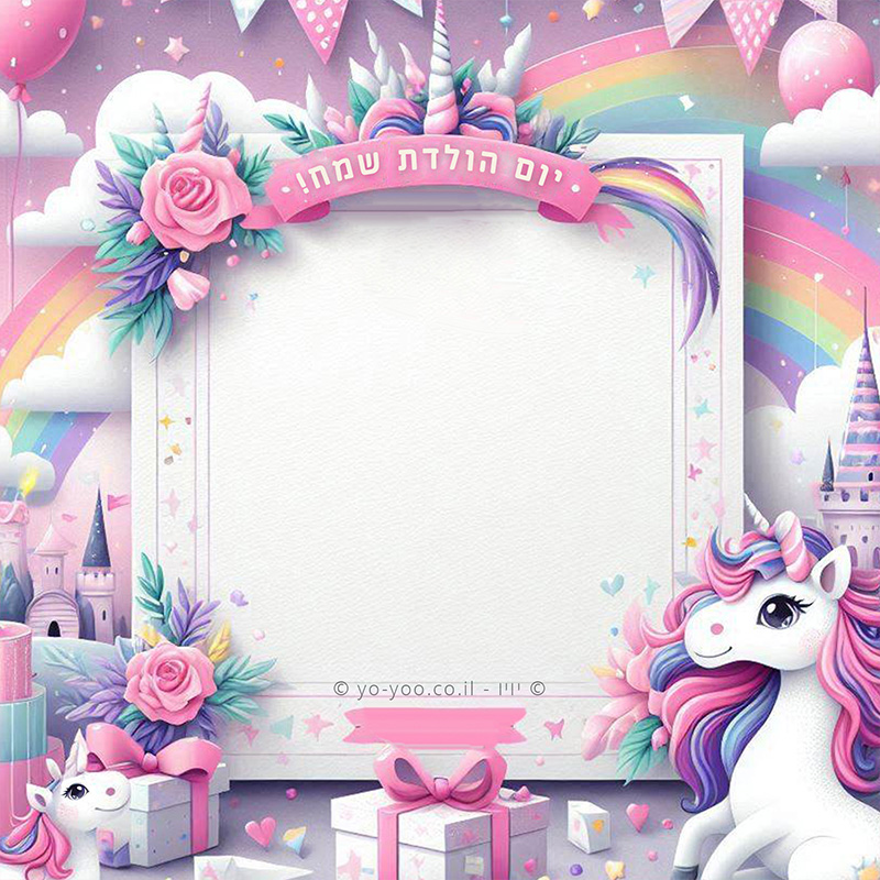 כרטיס ברכה מעוצב ליום הולדת בסגנון קסום עם חד קרן מתוק, קשת בענן, טירה ורודה ומתנות מעוטרות בסרטים. הכרטיס מושלם לילדים שאוהבים פנטזיה, פיות ויצורים מהאגדות. המסגרת מאפשרת הוספת ברכה אישית לחוגג או לחוגגת.