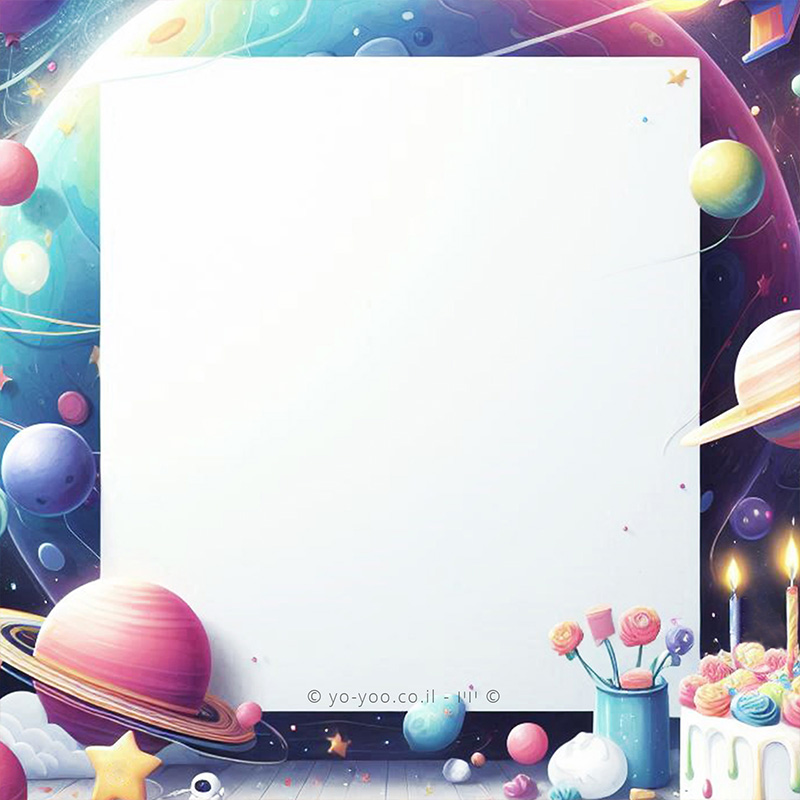 כרטיס ברכה מעוצב עם מסגרת בהשראת החלל החיצון הכוללת כוכבים, כוכבי לכת צבעוניים, שבתאי עם הטבעות, רקע גלקטי מרהיב ואפקטים של זוהר. בפינת הברכה מופיעה עוגת יום הולדת עם נרות לצד קישוטים מתוקים, מה שמוסיף לאווירה החגיגית. מתאים במיוחד לילדים שאוהבים את עולם האסטרונומיה, הכוכבים והמדע הבדיוני.