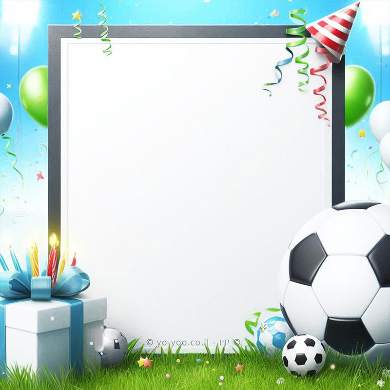 כרטיס ברכה מעוצב עם מסגרת ספורטיבית בנושא כדורגל, מושלם לחובבי הספורט והמשחק הפופולרי. המסגרת מעוטרת בכדורי כדורגל בגדלים שונים, בלוני הליום ירוקים ולבנים, כובעי מסיבה צבעוניים, מתנות עטופות, ונרות יום הולדת בוערים, היוצרים אווירה חגיגית. הרקע מציג דשא ירוק ומגרש כדורגל מואר, מה שהופך את התמונה למתאימה במיוחד לילדים וחובבי המשחק.