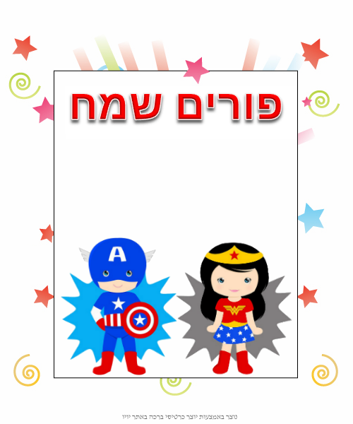 כרטיס ברכה עם גיבורי על לפורים כרטיס ברכה לפורים עם ילדים מחופשים לגיבורי על עם קפטן אמריקה וגם וונדר וומן , כרטיס ברכה יפה לפורים עם תחפושות כתבו פה את הברכה שלכם לחצו פעמיים כדי לערוך את הטקסט חג פורים שמח לכולם