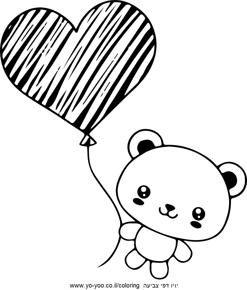 דף צביעה של דובי עם בלון לב להדפסה או להורדה בחינם, למחשב או לטלפון (אפשר להדפיס גם מהטלפון)