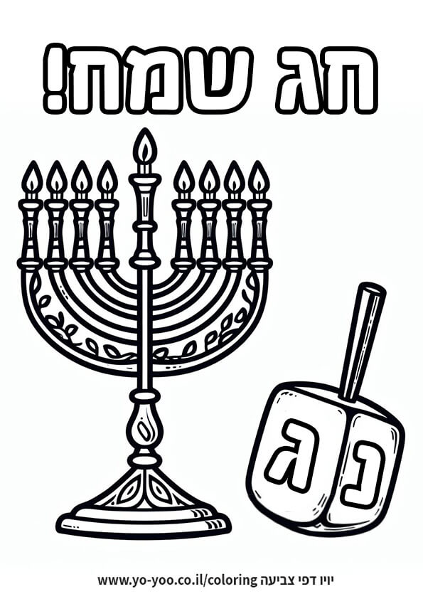 דף צביעה של חנוכייה וסביבון להדפסה בחינם
