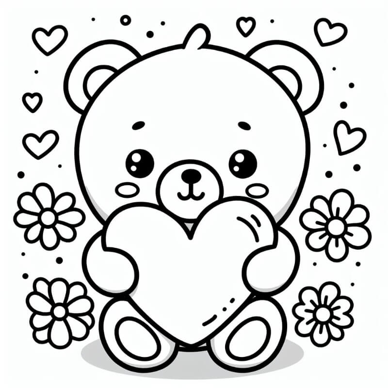 ציור של דובי עם לב לצביעה, איור של דובי עם לב להדפסה לצביעה לילדים