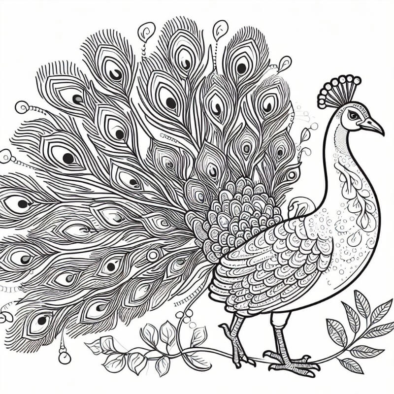 ציור של טווס לצביעה, איור של טווס להדפסה לצביעה לילדים