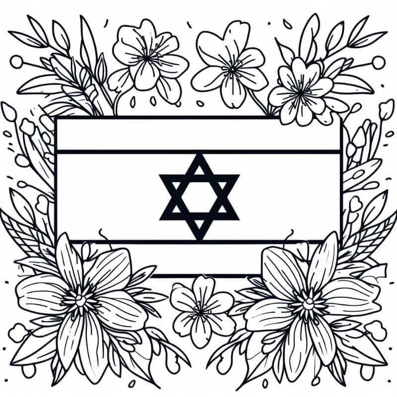 דף צביעה תמונה של דגל ישראל עם פרחים יפים לצביעה בחינם להדפסה או צביעה אונליין