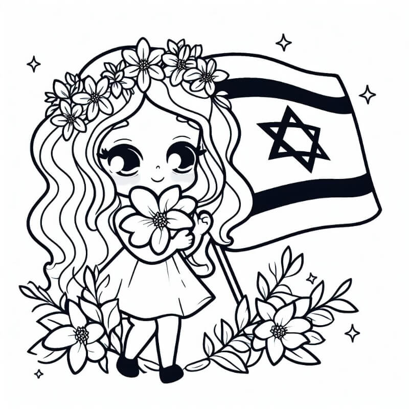דף צביעה להדפסה או להורדה חינם של ילדה עם דגל ישראל ופרחים