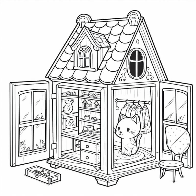 בית בובות חתולים לצביעה - בית בובות בסגנון של בית בובות של חתולים, בית בובות בצורת חתול יפה וחמוד