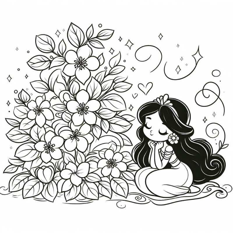 דף צביעה של יסמין להדפסה או להורדה בחינם, למחשב או לטלפון (אפשר להדפיס גם מהטלפון) ציור של יסמין לצביעה, איור של יסמין להדפסה לצביעה לילדים