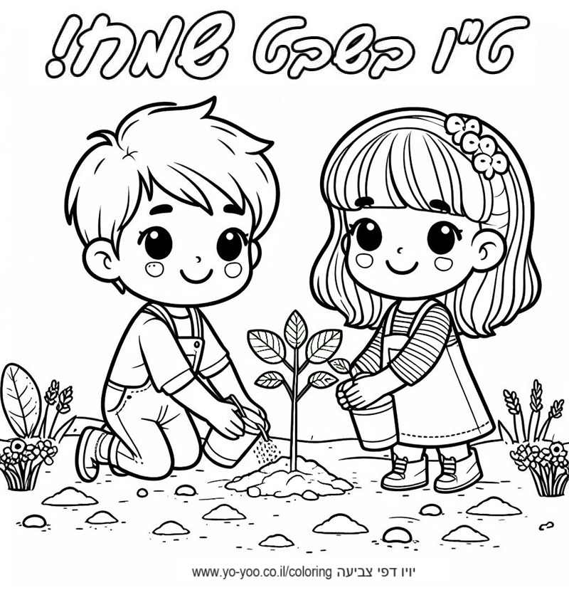 דף צביעה של ילדים נוטעים בטו בשבט להדפסה בחינם