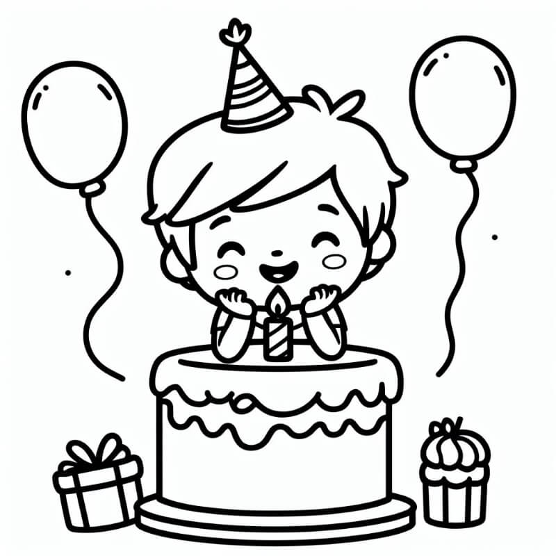 דף צביעה של עוגה וילד יום הולדת להדפסה בחינם
