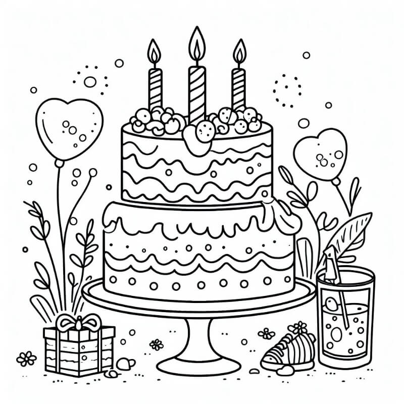 ציור של עוגה ליום הולדת לצביעה, איור של עוגה ליום הולדת להדפסה לצביעה לילדים