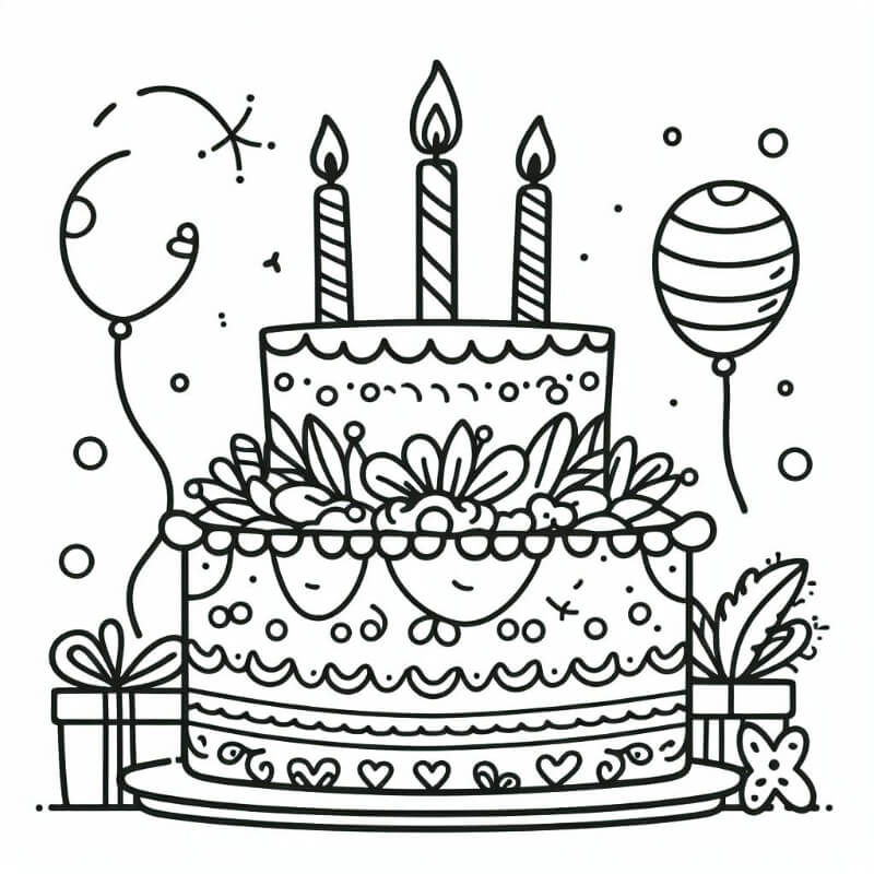 ציור של עוגה של יום הולדת לצביעה, איור של עוגה של יום הולדת להדפסה לצביעה לילדים