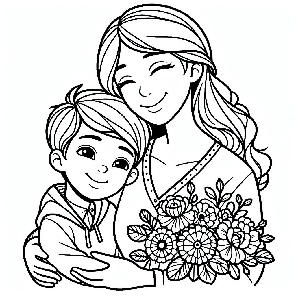 ציור של אמא ובן לצביעה, איור של אמא ובן להדפסה לצביעה לילדים