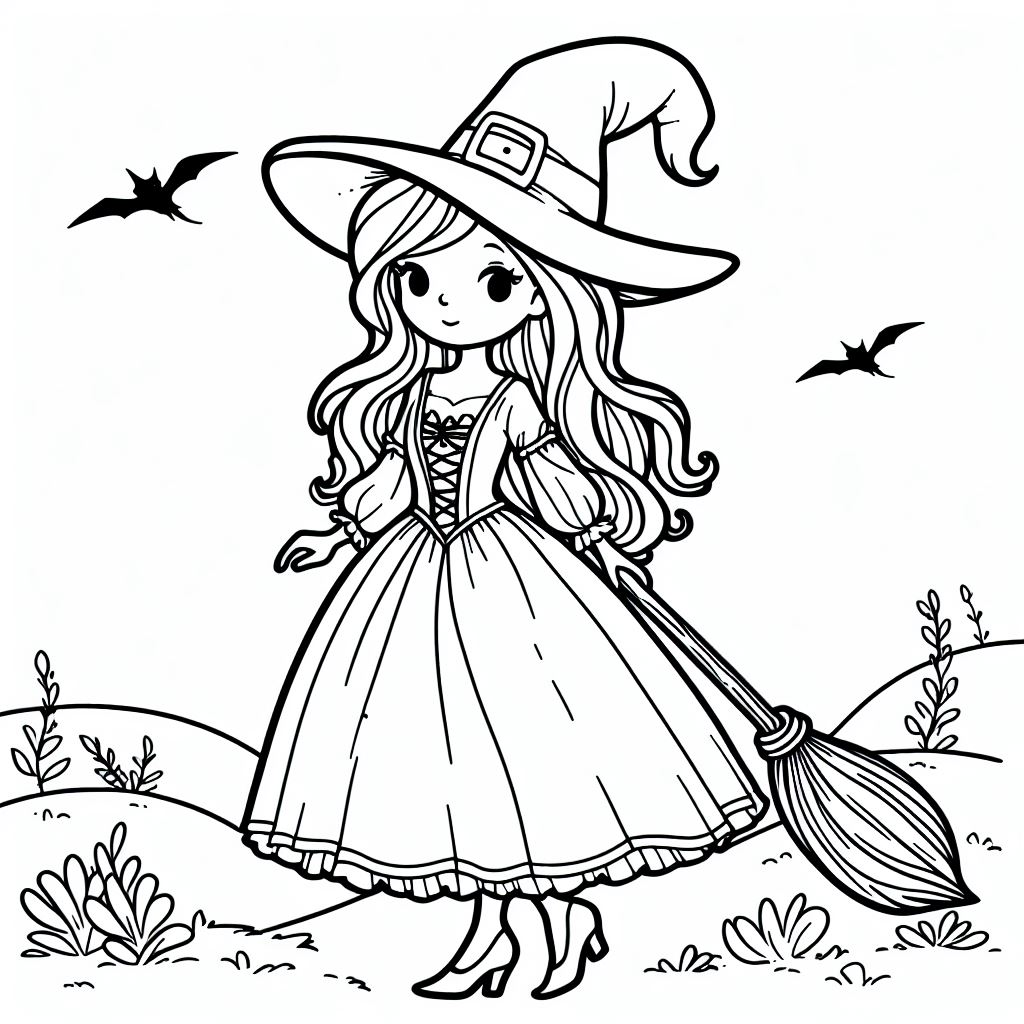 דף צביעה של מכשפה להדפסה או להורדה בחינם, למחשב או לטלפון (אפשר להדפיס גם מהטלפון) ציור של מכשפה לצביעה, איור של מכשפה להדפסה לצביעה לילדים