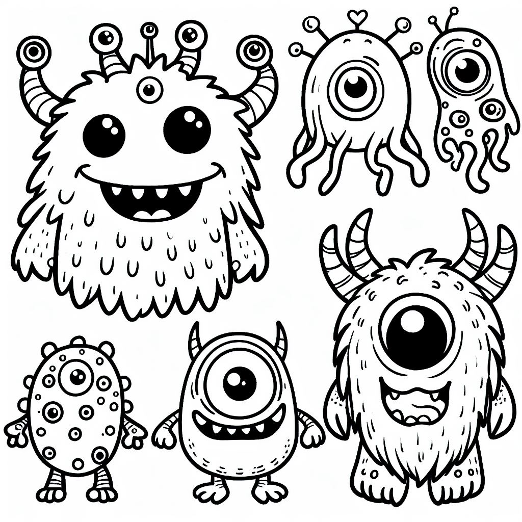 תמונה של מפלצות חמודות בשחור לבן להדפסה בחינם. דף עבודה לצביעה של מפלצות חמודות להורדה או שמירה במחשב.