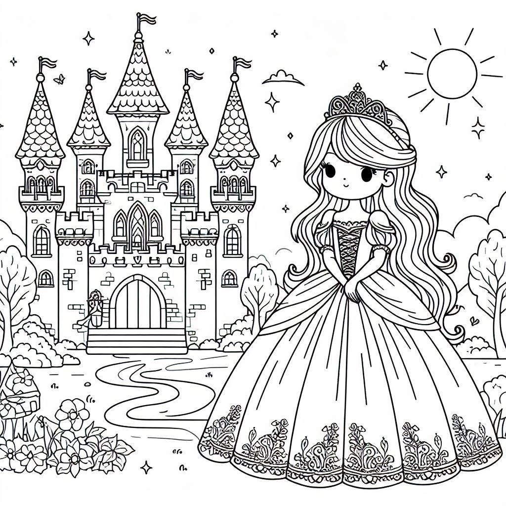 ציור של נסיכה ואגדה לצביעה, איור של נסיכה ואגדה להדפסה לצביעה לילדים