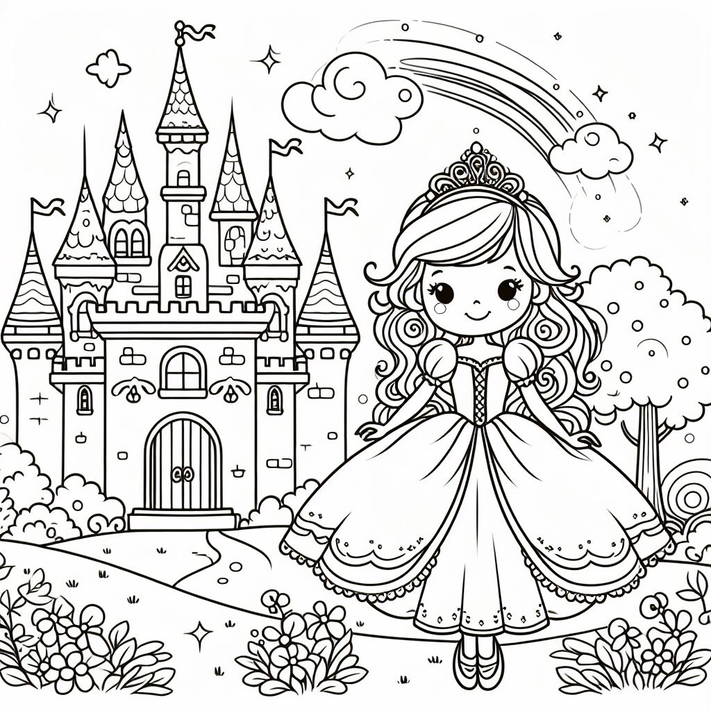 ציור של נסיכה וטירה לצביעה, איור של נסיכה וטירה להדפסה לצביעה לילדים