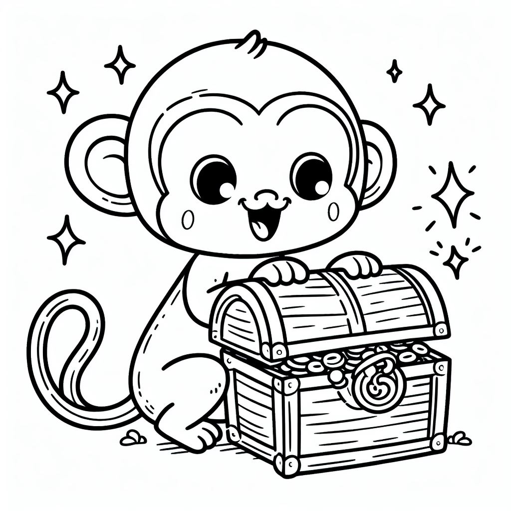 קוף עם תיבת אוצר לצביעה - דף צביעה של קוף עם תיבת אוצר להדפסה, ציור של קוף עם תיבת אוצר לצביעה בחינם
