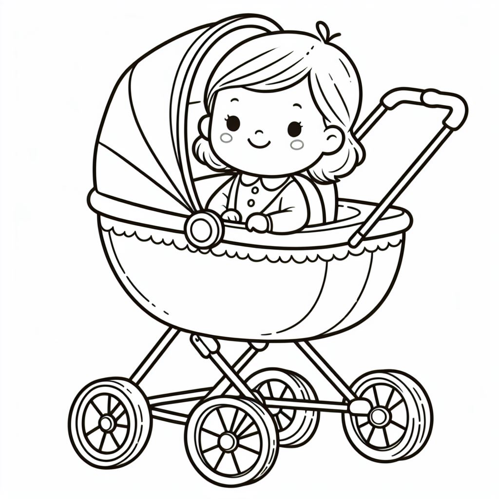 ציור של תינוקת בעגלה לצביעה, איור של תינוקת בעגלה להדפסה לצביעה לילדים