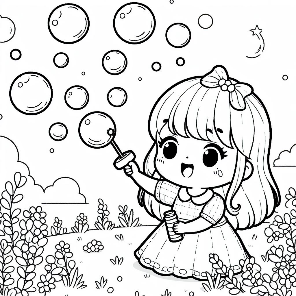דף צביעה של ילדה עם בועות סבון להדפסה בחינם
