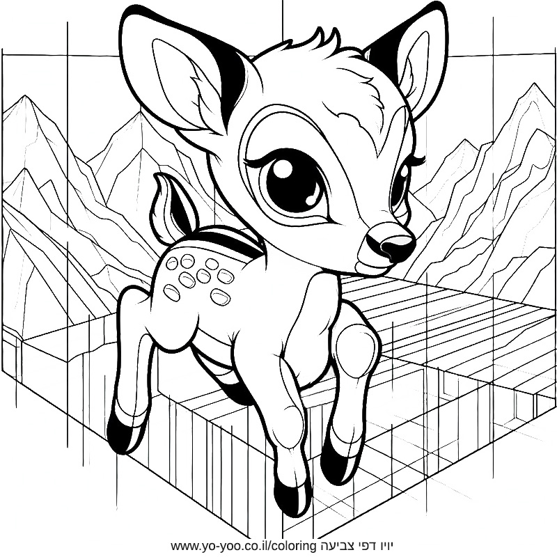 ציור של במבי בתלת מימד לצביעה, איור של במבי בתלת מימד להדפסה לצביעה לילדים